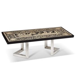 in bicromia nero-bianca, raffigurante carro degli dei entro decoro a girali fogliacei desinenti in putti e cartouches con leone rampante ai cantoni, firmato 1679 al centro della scena; montato su base moderna, cm 37x118x59