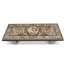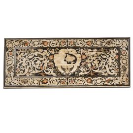 in scagliola policroma, campo decorato con fitto intreccio di girali fogliacei, fiori, pappagalli ed uccelli ad ali spiegate a centrare cartouche con aquila coronata, entro bordura analogamente lavorata; montato entro moderna, cm 39,5x218x91