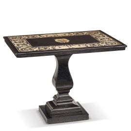 in scagliola policroma con stemma centrale e fregio di contorno con ricco intreccio di giroli fogliacei con personagg, putti, uccelli e fiori, raffiguranti ai centri superiore ed inferiore coppia di leoni alati affrontati e centrati da candelabra, ai centri laterali divinità marine bicaudate con cartiglio, ed affrontati su sostegno centrale anche'esso in scagliola in foggia di balaustro su base modanata; cm 83x111x80