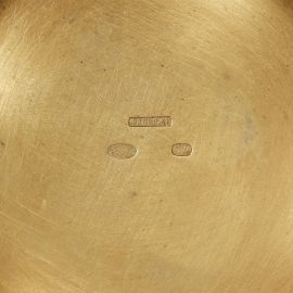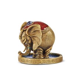 in smalto blu traslucido, diamanti a rosette e rubini cabochon con montatura in oro e metallo dorato, il coperchio è sormontato da motivo a pigna che scende su decori a girali, ed è impreziosito da emblemi della Casa Imperiale russa intervallati da monogrammi dello Zar Alessandro III; all’interno presenta un elefante in oro parzialmente smaltato; la parte inferiore del guscio è decorata con applicazioni a motivi fogliacei intrecciati ed è sostenuta da coppia di leoni rampanti affrontati su base circolare con volute rocaille; alt. cm 20