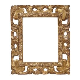in legno intagliato e dorato, battuta sale su fascia profilata a decoro fogliaceo, la quale si porta su ricco intaglio a giorno con foglie aperte agli angoli; ingombro cm 36x31, luce cm 17,8x23,2 e 18x22,8