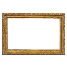 in legno intagliato e dorato, battuta a fusarola e perline sale su fascia a gola e si porta su profilo a foglie lanceolate e baccellatura; ingombro cm 55,5x37, luce cm 45x27