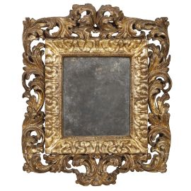 in legno intagliato, scolpito e dorato, battuta a perline e fusarole sale su fascia a mezzefoglie aperte sugli angoli e si porta a muro tramite ricco intaglio a giorno a motivo di volute fogliacee, che si incontrano al centro nei lati superiori e inferiori; ingombro cm 85x69, luce cm 66,5x31,5. Montata a specchio