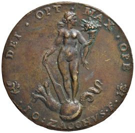 Ae mm. 62/63 ANDREAS GRITTIS VENET PRINC AN LXXXII Busto a d. con corno e abiti dogali R/ DEI OPT MAX OPE La Fortuna con timone e cornucopia in piedi su globo, su cui è attorcigliato un drago a tre teste. Sotto: IO ZACCHVS F. Rif: Volt. 293; Pollard III, 753; Toderi-Vannel I 638