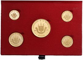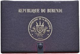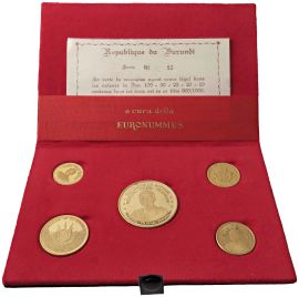 BURUNDI. REPUBBLICA (DAL 1966). SERIE COMPLETA DI CINQUE VALORI IN ORO 900 (100, 50, 25, 20 E 10 FRANCHI 1967) IN ASTUCCIO ORIGINALE E CERTIFICATO DI EMISSIONE N. 52