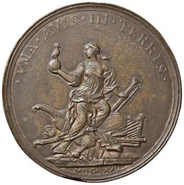 Ae mm. 83 Busto a d. coi capelli annodati. Sotto IOS BROCCETTI R/ La Fama seduta su di un cumulo di strumenti musicali regge una sfera, con la d., e una tromba, con la s. Rif: Volt. 1420; Johnson 123; Vannel-Toderi 107