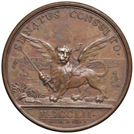 Ae mm. 55 Busto di tre quarti a d. con pizzo, corpetto e mantello R/ Il Leone di San Marco, gradiente a s. e con le ali spiegate regge la spada d’onore. Sullo sfondo, Venezia e la sua laguna con un veliero Rif: Volt. 1523; Forrer I, p. 516; Pialorsi 1990, 56.