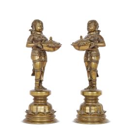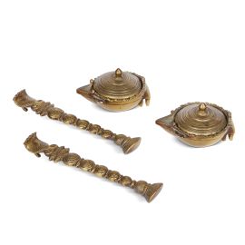 in bronzo raffigurante due soggetti femminili che reggono delle pentole con coperchio. Sono in piedi su di una base a fiore di loto. La treccia dei soggetti e le rispettive pentole sono smontabili.