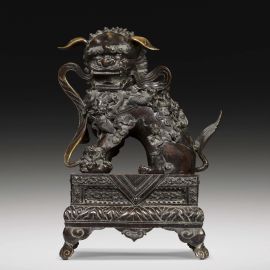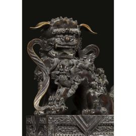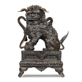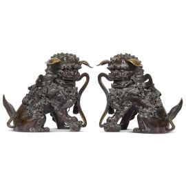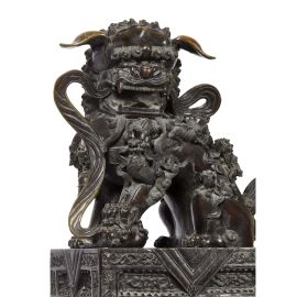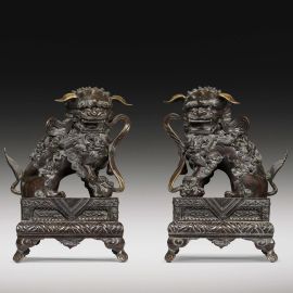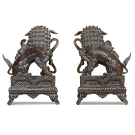 Le statue dei leoni guardiani erano tradizionalmente poste di fronte ai palazzi degli imperatori cinesi e alle loro tombe, ai templi e ai palazzi degli alti ufficiali o nobili quale potente simbolo apotropaico. Si tratta di un ornamento tipico della tradizione cinese, stilema decorativo nato nell'ambiente del buddhismo cinese con intento apotropaico. I leoni sono rappresentati in coppia che dovrebbe consistere di un maschio con una sfera intagliata tra gli artigli (a simboleggiare il dominio dell'imperatore sul globo terracqueo) e una femmina che trattiene un cucciolo giocoso supino sotto di lei (a simboleggiare il nutrimento). Sono manifestazione di Yin (negativo) e Yang( positivo): la leonessa per lo Yin e il maschio per lo Yang. Il maschio ha la zampa anteriore destra su di una sfera apparentemente di stoffa, chiamata "palla ricamata" ( 绣球 ). La femmina è essenzialmente identica ma ha un cucciolo sotto la zampa sinistra a rappresentare il ciclo della vita. Simbolicamente, la leonessa protegge gli abitanti (l'anima vivente interna) e il maschio protegge la struttura (gli elementi materiali esterni) dell'edificio che entrambi sorvegliano. La coppia di leoni offerta in asta è fusa in bronzo con basi decorate a incisione e poggianti su piedi a forma di nuvole Ruyi. A causa dell'elevato costo di questi materiali e del lavoro richiesto per produrli, l'uso dei leoni custodi era probabilmente riservato alla famiglia imperiale, come simbolo di ricchezza e potenza, e non solo. In questo caso, degni di nota sono i sedici cuccioli sui corpi della coppia: quattordici sulle spalle e due vicino alle zampe. A differenza della più nota rappresentazione dei leoni bronzei come belve feroci, questa coppia è caratterizzata da un’immagine che esalta la dimensione famigliare e affettiva. Le orecchie non sono rivolte verso l'alto ma si abbassano docilmente, forse allusione alla discrezione nell’ascolto e al non interferire negli affari di corte. Si ravvisano protuberanze ossee sulle teste, campanelli ai colli, keyūra (璎珞) sul petto, svolazzi nelle bocche aperte. Le belle criniere, di rara e mirabile resa, coprono le parti posteriori della testa, il petto e i lati delle zampe. Gli artigli sono robusti, ma non pronti all’attacco. Probabilmente destinata all’Harem imperiale, questa coppia di leoni potrebbe ascriversi alla Cina della dinastia Qing, in virtù della tecnica artigianale di fusione e di incisione del bronzo.