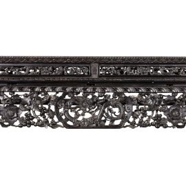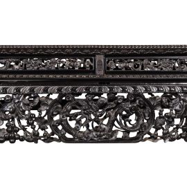 in legno duro intagliato con piano in marno, i quattro piedi sono a forma di zampe di bestia. Ritrae due draghi che giocano con una gemma infuocata, decorato con vitigni di uva, fiori di Mudan e scoiattoli.