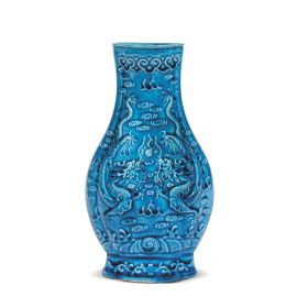 清 十九世纪 孔雀蓝釉龙纹瓶一件及绿釉观音瓶两件 高13,5-13,8厘米