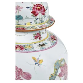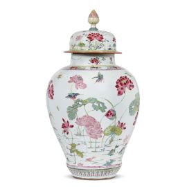 in porcellana policroma Famiglia Rosa a forma Jiangjunping decorato con fiori di loto ed uccellini.