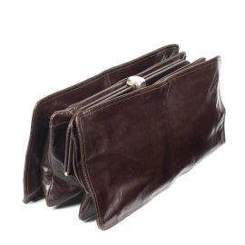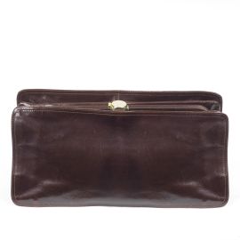 In una raffinata pelle celeste polvere con interno in tela beige logata; con apertura su due lati: uno per portamonete e lìaltro per soldi, documenti e 7 cc, con logo smaltato su punto di chiusra.