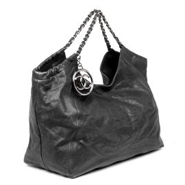 Ottima grande borsa shopping per un uso quotidiano in pelle granulata Caviar nera anticata e manici in catena in ottone color argento con pelle intrecciata. Charm con logo e logo trapuntato frontale. Fodera in tessuto nero logo all over.