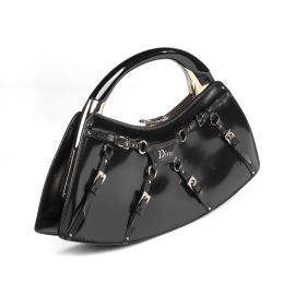 Con una particolarissima forma a mezza luna e costruzione rigida, in pelle spazzolata nera, dettagli in metallo caratteristici della Maison sul lato frontael con logo centrale; chiusura in ottone color oro e manico rigido in resina nera. Fodera interna nera con logo allover e piccola tasca con zip.