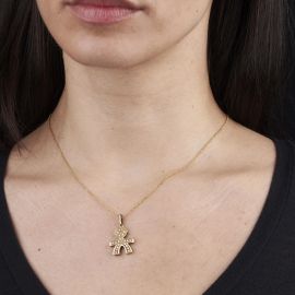 in oro giallo 18kt, collana con ciondolo a forma di piccola figura umana impreziosita da diamanti taglio brillante per ct 0.20 circa, punzoni 750 e del fabbricante, lungh. cm 41, accompagnata da un pendente in oro giallo e corallo, a forma di croce, punzone 750, dim. cm 5x6 circa, gr. 15 complessivi