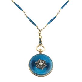 catena in oro giallo 18kt con elementi in smalto blu, da cui pende un orologio con cassa in oro giallo 18kt, punzone francese, quadrante bianco firmato "E. Gubelin. Lucerne", numeri arabi, cassa decorata in smalto blu con motivo guilloché e rosone centrale in argento e diamanti, movimento a carica manuale (difetti), diam. mm 23. Corredata di scatola.