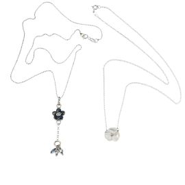 in oro bianco 18kt, di cui una collana con ciondolo a forma di fiore, petali in madreperla e piccolo diamante centrale, lungh. cm 42; accompagnata da una seconda collana con pendente a forma di fiore impreziosito da zaffiri taglio rotondo e ovale per ct 1 circa e piccolo diamante centrale, lungh. cm 43, punzoni 750 e del fabbricante, gr. 7 complessivi