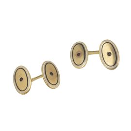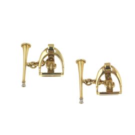 di cui uno in oro giallo 18kt, composto da due elementi a forma di staffa e trombette unite da catene, firmati "Made in England", accompagnato da un secondo paio di gemelli in oro giallo 14kt, di forma ovale e decorato in smalto, dim. cm 1x2x2,5 circa, gr. 24 complessivi