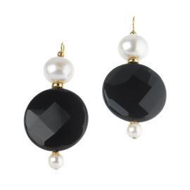 di cui un paio in oro giallo 18kt, composto da perle di mm 15 circa e mm 7 circa, con grandi dischi in pietra nera di diam. cm 3 circa, lungh. cm 3x6,5, chiusura a gancio; accompagnato da un secondo paio di orecchini in oro bianco 18kt, impreziositi da una fila di diamanti taglio brillante, da cui pendono due gocce sfaccettate in pietra nera, chiusura a farfallina, punzone 750, lungh. cm 3,5, gr. 40 complessivi circa