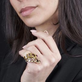 in oro giallo e bianco 18kt, realizzato a fascia ondulati, impreziosito da rubini taglio navette per ct 1.50 circa, firmato "Fumanti Roma", mis. 45, gr. 16