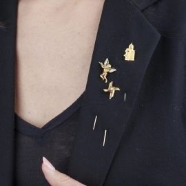 in oro giallo 18kt, di cui uno a forma di basilica e una seconda a forma di girandola impreziositi da due diamanti taglio brillante, lungh. cm 6, accompagnati da una terza spilla raffigurante un angioletto che suona il flauto impreziosito da diamanti taglio brillante e smeraldi, lungh. cm 7,5, punzone 750, gr. 8 complessivi