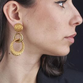 in oro giallo 18kt, a forma di dischi intrecciati con superfici cesellate, punzone 18kt, chiusura a clip, dim. cm 3,5x6,5, gr. 52 complessivi