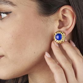 in oro giallo 18kt, al centro due lapislazzuli taglio cabochon cinti da un motivo a corda, punzoni 750 e del fabbricante, chiusura a clip con perno, dim. cm 2x2, gr. 17 complessivi