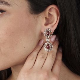 in oro giallo e bianco 18kt, raffiguranti un motivo floreale, impreziositi da quattro rubini taglio cabochon per ct 5 circa circondati da diamanti taglio rotondo (uno mancante), punzoni 750 e del fabbricante, dim. cm 1,5x4, gr. 15 complessivi