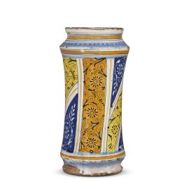 in maiolica dipinta in policromia, corpo cilindrico rastremato al centro, piede a disco e breve colletto con orlo estroflesso; decoro caratterizzato da due metope delimitate da una fascia verticale di colore giallo arancio sulla quale è delineato, in bruno, un decoro sottile a tralci ricurvi con piccole infiorescenze, e tra le metope due ampie riserve rettangolari suddivise da linee diagonali in tre porzioni decorate alternativamente a risparmio su fondo azzurro e in manganese su fondo giallo; alt. cm 24,7, diam. bocca cm 10, diam. base cm 10,5