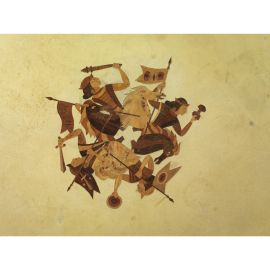 struttura in legno e metallo, ripiano rivestito in pergamena con intarsi in legno