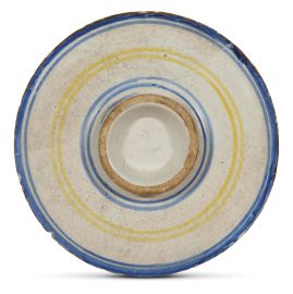in maiolica dipinta in policromia, poggiante su base alta applicata a crudo, di forma piana con l’orlo appena rilevato. L’intera superficie del fronte è decorata con il motivo a fruttini e uccelli, mentre al verso sono presenti righe concentriche giallo e blu. L’ornato è raro e trova precisi riscontri in opere del Museo Medievale di Bologna, tra cui un vassoio ovale e una coppa da malato con decoro analogo; diam. cm 21,4, diam. piede cm 8, alt. cm 3,3