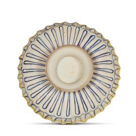 in maiolica dipinta in policromia, formata a stampo con umbone centrale rilevato, orlo mosso e corpo sbalzato. La decorazione sul fronte raffigura la scena biblica della Caduta della manna dal cielo durante l’esodo, tratta dall’incisione di Hans Sebald Beham nella “Bibbia di Francoforte”. Lo stile particolare con cui è dipinta la scena trova un riscontro assai calzante in una crespina del Museo di Cluny, pubblicata nel 1974 da Jeanne Giacomotti con attribuzione ancora incerta tra Lione e Urbino, ora correttamente ricondotta tra le opere prodotte dalle fornaci di Pesaro nella seconda metà del XVI secolo, in particolar modo nella bottega del cosiddetto “Pittore di Zenobia”; diam, cm 27,8, diam. piede cm 12,4, alt. cm 7,5