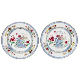 in porcellana policroma dipinta in policromia, secondo un decoro di ispirazione orientale, che vede nel cavetto una ricca decorazione floreale con rocce stilizzate sulle quali è posato un uccello del paradiso, sulla fascia di stacco una larga striscia continua a motivi geometrici intervallata da quattro riserve ovali contenenti pini cinesi, mentre sulla tesa quattro mazzetti di fiori europei. E proprio nella compresenza di decori cinesi tipici della “famiglia rosa” e decori a fiori europei sta la particolarità di questa coppia di piatti, riferibili al secondo periodo della Manifattura; diam. cm 23