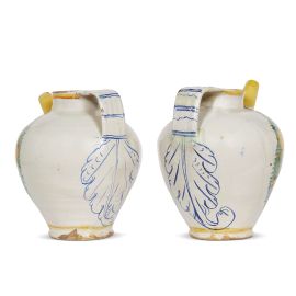 in maiolica dipinta in policromia, corpo fortemente globulare con collo stretto, cannello breve portato rilevato e ansa a nastro piuttosto larga; il decoro, che si sviluppa principalmente sul fronte, prevede un medaglione con cornice a ghirlanda sormontato dall’emblema dello Spirito Santo, ad incorniciare un’ampio cartiglio con voluta marcata ai lati, iscritto rispettivamente AQA.DE.BURAGINE e AQA.VIOLATA. Due vasi analoghi, già nella collezione Serra con attribuzione a Faenza, hanno recentemente trovato una proposta attributiva a manifatture eugubine del XVII secolo. Altri esemplari, accompagnati anche da albarelli dello stesso corredo, sono conservati nel museo di Gubbio, mentre una coppia è presente al MIC di Faenza con attribuzione a Casteldurante; alt. cm 30 e 31, diam. bocca cm 9,8 10,4, diam. piede cm 13,5 e 13,2