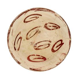 in maiolica decorata in lustro metallico e blu, di forma svasata con orlo estroflesso, presenta sul fronte una ricca teoria di tralci fogliati ad incorniciare un volatile con ali spiegate. Al retro decori a forma di spirale ovalizzata; diam. cm 20,5, alt. cm 3,5