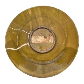 in maiolica dipinta in “bianco su bianco” e blu di cobalto, forma con cavetto profondo e largo, tesa ampia e appena obliqua che termina in un orlo rifinito a stecca appena rilevato, piede ad anello che presenta i consueti fori di sospensione predisposti prima della cottura. L’ornato mostra un minuto, anche se corrivo, decoro “bianco su bianco”, centrato dal simbolo dell’incudine con martello, qui accompagnato dalle lettere F R e datato 1545, il tutto dipinto in blu. Il retro è ricoperto da ingobbio verde e mostra una vecchia etichetta di collezione parzialmente rovinata; diam. cm 40, diam. piede cm 14, alt. cm 8,2