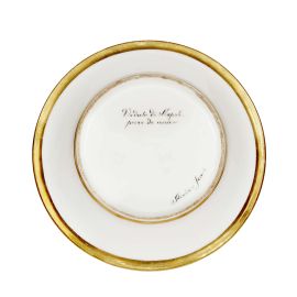 in porcellana dipinta in policromia e oro, raffigurante veduta e scena popolare. La tazza, di foggia francese, e il piattino con tesa di fondo azzurro e decorazioni in oro appartengono alle serie prodotte nell’ambito del Grand Tour, molto ricercate dai viaggiatori. La tazza iscritta sul fondo Ritorno della festa/ della Madonna/ dell’Arco e Giovine fece, alt. cm 11,5; il piattino iscritto Veduta di Napoli/ presa da mare e Giovine fece, diam. cm 16,5