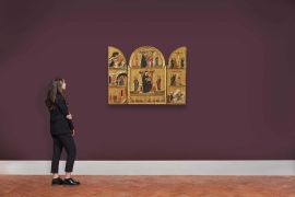 Il Trittico a fondo oro con sportelli laterali mobili qui proposto è un esempio dell’operato del Falsario di Edimburgo, che ipoteticamente e presumibilmente operò a Siena nella scia di Icilio Federico Joni (Siena 1866-1946). Tale attribuzione è evidenziata in maniera chiara dalla pubblicazione (relativa alla tavola in questione) a cura di Gianni Mazzoni, “Quadri antichi del Novecento”, edizioni Neri Pozza, Vicenza 2001, collana I Colibri, fig 203,pag 442, che mette in relazione la “nostra opera“ con quella di quasi analogo soggetto, ma con una disposizione spaziale diversa, concernete le rappresentazioni delle storie della vita di Gesù, acquistata nel 1943 sul mercato londinese dalla National Gallery of Scotland di Edimburgo ed ancora ivi presente. Si tratta quindi, nel contesto, di un curioso e importante ritrovamento che meglio delinea la figura di questo artista/ falsario, emulo della pittura primitiva senese in particolare di quella legata alla matrice Duccesca. La parte centrale di questo Fondoro di generose dimensioni, eseguito in maniera stilisticamente un po’ eclettica e fantasiosa , rispetto ai canoni dello Joni, è legata fortemente dal punto di vista iconografico e artistico, al Tabernacolo n.35 eseguito da un seguace di Duccio di Buoninsegna esposto nella Pinacoteca Nazionale di Siena.