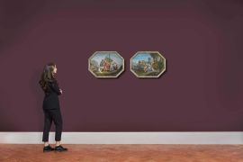 coppia di dipinti ottagonali olio su vetro, cm 42,5x60