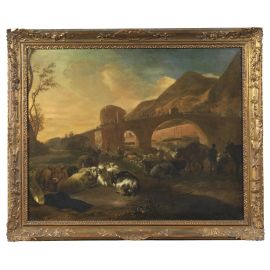 A LANDSCAPE WITH HERDS AND A BRIDGE ON THE BACKGROUND