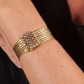 in oro giallo 18kt, realizzato a maglia morbida, con sette fili di maglie rettangolari in oro satinato, chiusura impreziosita da zaffiri taglio rotondo (uno mancante) per ct 1.20 circa, punzoni 750 e del fabbricante, lungh. cm 19, gr. 51
