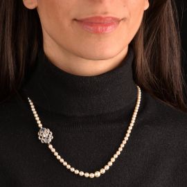 ad un filo di perle digradanti di mm 6-4 circa, fermatura in oro bianco 18kt impreziosita da un diamante centrale taglio rotondo di ct 0.70 circa, circondato da due zaffiri taglio rotondo per ct 0.40 circa e diamanti taglio huit huit per ct 0.30 circa, lungh. cm 50, gr. 16