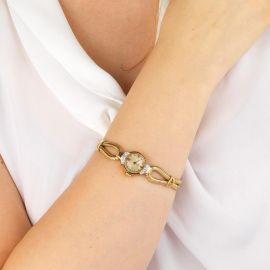 cassa in oro giallo 18kt, fondello a pressione, anse impreziosite da piccoli brillanti, quadrante argenté con indici applicati, bracciale a cordicella a due fili in oro giallo 18kt con chiusura a scomparsa in oro giallo, gr. 36. Diam. mm 16.