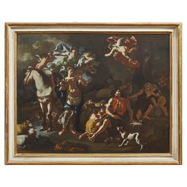 Totalmente diverso nell’impianto compositivo e nella proporzione delle figure rispetto al paesaggio, questo Arrivo di Erminia tra i pastori (Spinosa 2018, fig. 190.1) si caratterizza per la raffigurazione di Erminia a destra in primo piano, di profilo e seguita dal cavallo. La stessa figura ricorre in un modelletto autografo da Sotheby’s nel 1994 (Spinosa, fig. 190.2).