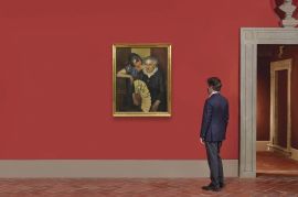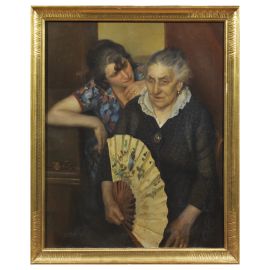Nell’opera presentata in catalogo le ‘confidenze’ tra la giovane e l’anziana signora catturano lo spettatore rendendolo partecipe di una malinconica intimità.
