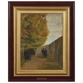 Un filo diretto lega dunque il bozzetto venduto da Pandolfini nell’asta del 14 maggio 2019 alla straordinaria versione definitiva che abbiamo l’onore di riportare alla luce nel nostro catalogo. Rispetto al bozzetto, nell’opera presentata -anch’essa databile al fatidico 1866- il sentiero sterrato si arricchisce dei protagonisti di spalle -dei quali si conserva uno studio a matita presso il Gabinetto dei disegni e delle stampe degli Uffizi-, mentre il muretto permane a delimitare l’orizzonte e le chiome degli alberi sono lambite dai raggi del sole. Il pennello del pittore costruisce la scena con quell’equilibrio strutturale e cromatico in grado di rivelare le instancabili ricerche della poetica della ‘macchia’, la consapevolezza della complessità nella ricerca della semplicità e l’amore per una natura non edulcorata, mentre la sensibilità malinconica e delicata dell’artista accompagna lo spettatore in un angolo silente, nell’apparente quiete che può precedere l’evento che può cambiare la vita o addirittura porvi fine.
