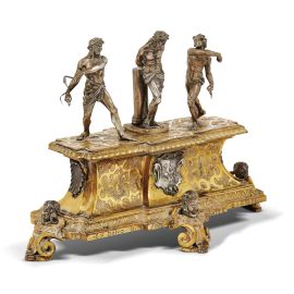 composto da tre figure in argento a rappresentare l'episodio della flagellazine di Cristo, su base in bronzo e rame dorato con applicazioni in argento. Le sculturine in argento, di chiara derivazione algardiana, sono presentate su un alto piedistallo sagomato di impianto rettangolare, con pareti verticali svasate, decorato a bulino e impreziosito da rilievi in argento, che poggia su quattro piedi a voluta decorati con testa di cherubino scolpita a tutto tondo, sempre in argento. Sul fronte stemma araldico non identificato; cm 37x19,5x25