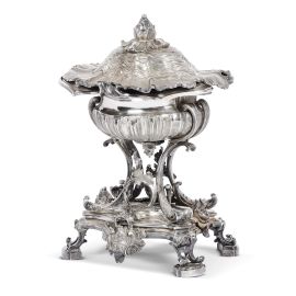 in argento sbalzato e cesellato, coppa ovale sorretta da foglie e volute, coperchio in foggia di grande foglia con presa in forma di frutta, base poggiante su quattro piedini a ricciolo, alt. cm 25