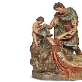 Questo grande e prezioso gruppo plastico in terracotta, dipinto in vivace policromia, traspone in scultura uno degli episodi più celebri della Gerusalemme liberata, poema eroico di Torquato Tasso. Nel canto XII infatti il cavaliere cristiano Tancredi, innamorato della guerriera musulmana Clorinda, è costretto dalla sorte a battersi in duello proprio contro di lei e ad ucciderla; in punto di morte Clorinda si converte e viene battezzata dallo stesso guerriero. Pur essendo notevole la qualità della composizione, al momento non siamo in grado di proporre un’attribuzione specifica per questo gruppo, per il quale però la fonte iconografica sembra possa essere riconosciuta in un dipinto del pittore Gaetano Lapis (Cagli 1706 – Roma 1773) con uguale soggetto pubblicato nel 1994 (A. Mazzacchera, B. Montevecchi, Gaetano Lapis: i dipinti di Cagli, Urbania 1994, pp. 53-54) e attualmente conservato presso la Fondazione Cassa di Risparmio di Pesaro.